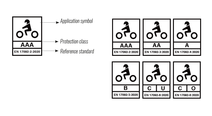 U zavisnosti od toga koji je tip opreme ili deo opreme sertifikovan neophodno je potražiti različite oznake, pa će tako vaša odeća nositi oznaku EN17902, protektori koji su nezavisno ili se nalaze u njoj EN1621 pa u zavisnosti od dela koji pokrivaju broj, čizme EN13634 itd.